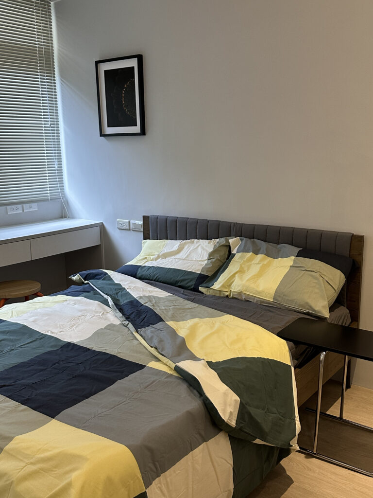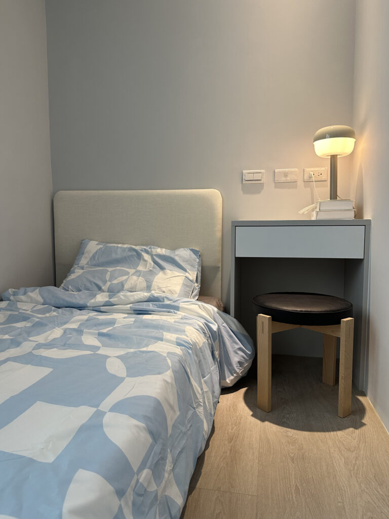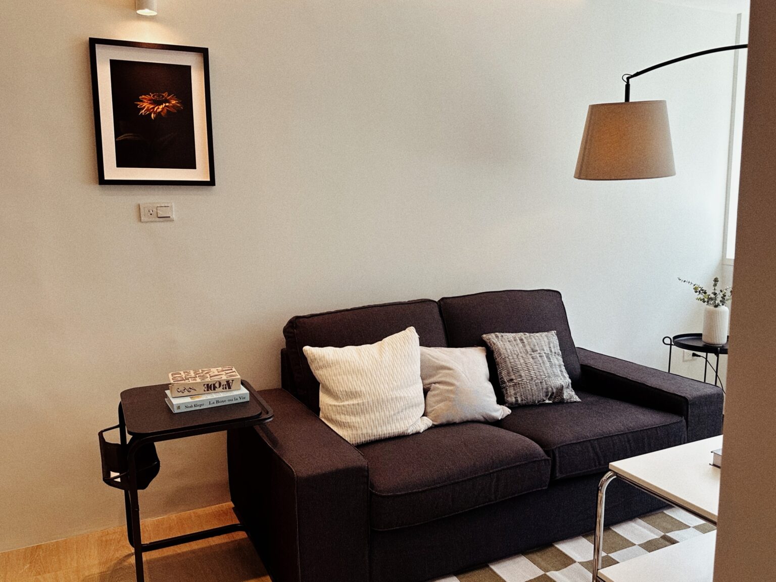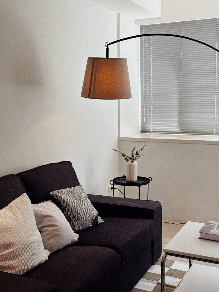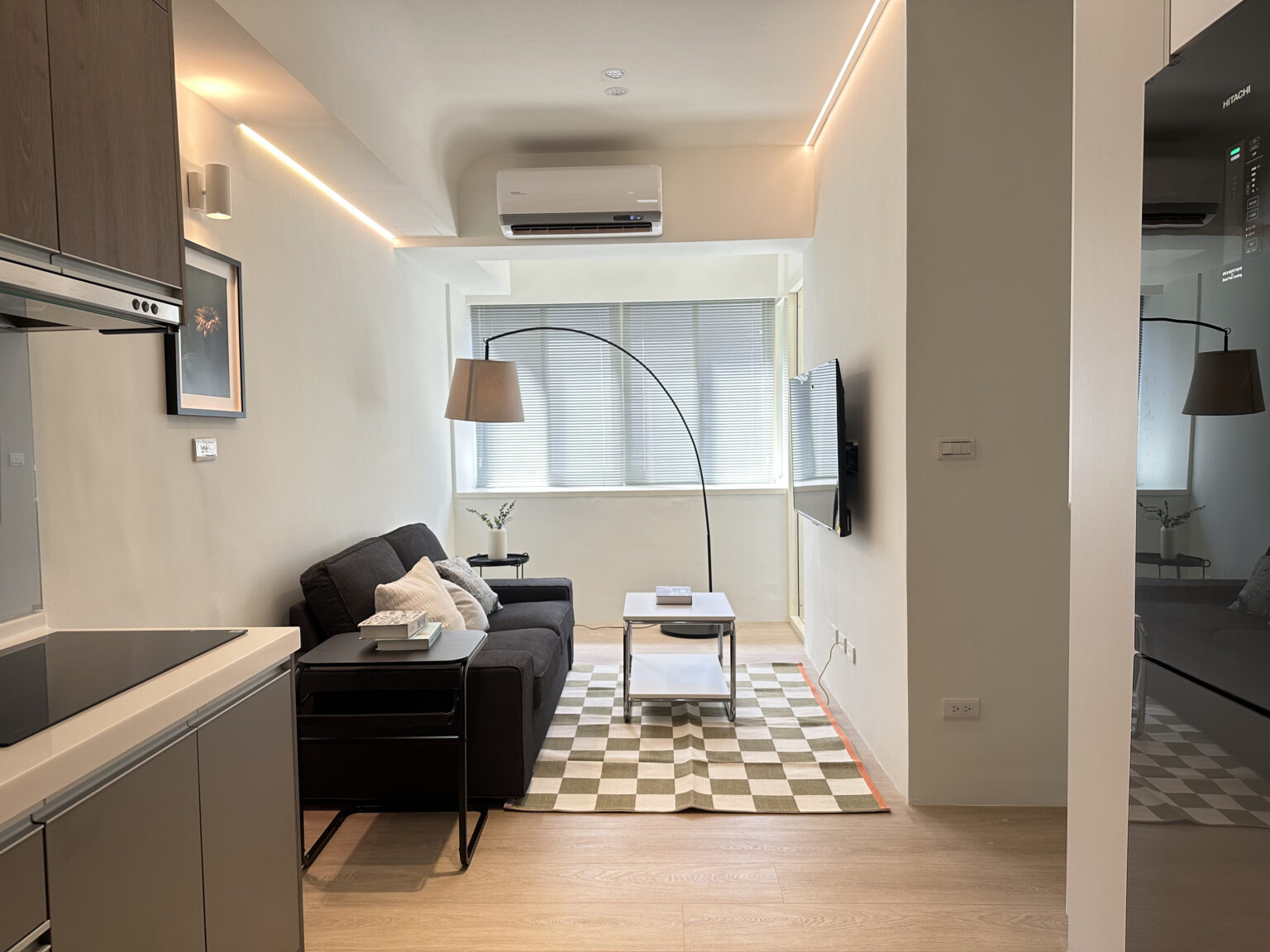UGUISUCHA 鶯茶 Case Type 空間軟裝設計 Location 新北市新店區 Size 16坪 Year 2025 Style 世紀中期風格(MCM) 時光感的日常:16坪 Mid-Century Modern 兩房小宅這間約16坪的兩房一衛浴公寓,透過中古屋翻新重新整理空間比例與動線,以 Mid-Century Modern(MCM) 的設計語言為主軸,打造簡潔而富有年代感的生活場景。整體基調以白中帶灰的牆面與暖白木色地板鋪陳出柔和背景,讓空間既明亮又具有溫度。 客廳以一張黑色沙發作為視覺重心,搭配經典釣魚燈的弧形線條,勾勒出 MCM 風格特有的優雅輪廓。地面鋪上綠白格紋地毯,為空間注入一抹復古趣味,同時也平衡黑色家具帶來的重量感。牆面與天花配置間接照明,柔化光線層次,使夜晚的客廳呈現溫暖而沉靜的氛圍。客廳自然延伸至開放式廚房,讓16坪的空間視覺上更加開闊。廚房櫥櫃以木色與深灰色搭配,呈現出 MCM 常見的沉穩配色;木質紋理帶來自然氣息,而深灰則強化整體的現代感與俐落度。開放式規劃也讓料理與日常交流更為流動,形成生活的核心場域。 臥室則回歸簡潔與實用。雙人房靠窗設計整面長桌,結合工作與閱讀功能,讓自然光成為最好的照明。牆面與木地板延續公共空間的色彩語言,使整體風格保持一致,也營造出安靜、舒適的休息氛圍。 在有限的坪數裡,透過比例、光線與材質的安排,這間小宅展現出 Mid-Century Modern 的經典精神:簡潔、實用,並帶著跨越時間的優雅。 Say Hello & Contact 跳脫框架去創造新的可能 立即預約免費諮詢
